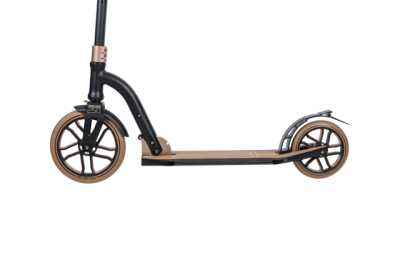 Фирменные двухцветные колеса - переднее диаметром 250 мм и заднее диаметром 200 мм шириной 30 мм изготовлены из прочной пластмассы, рабочей поверхностью служит полиуретан высотой 22-25 (!) мм, что совместно с подшипниками стандарта ABEC 9 дает отличный накат и амортизацию.