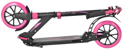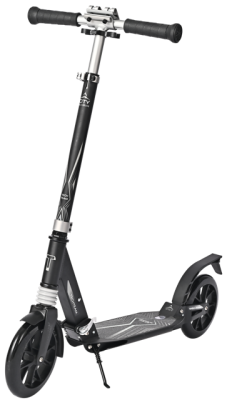 Прочная алюминиевая дека шириной 13.6 см и длиной 46 см покрыта износостойкой шкуркой (рабочая часть деки "footspace" - 33,5 см). Для удобства парковки самокат  оборудован складывающейся подножкой.